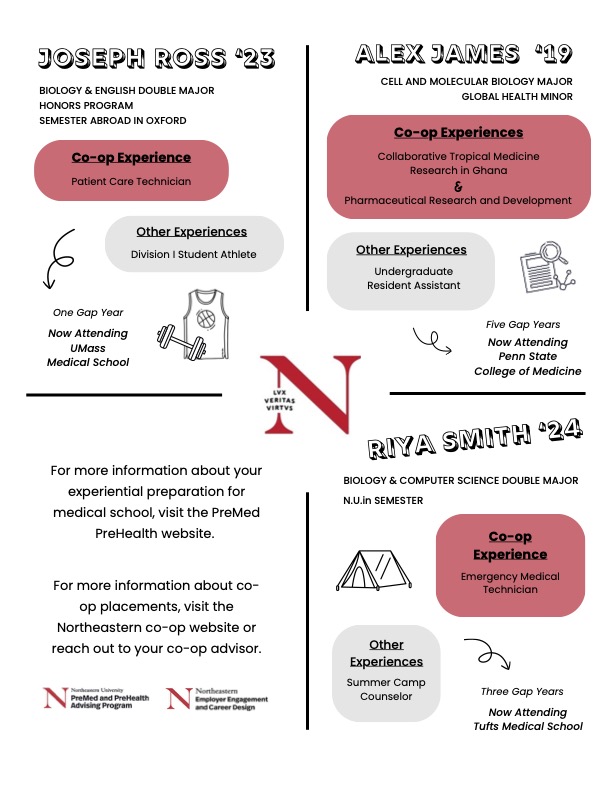 Experiential preparation is an important component of a competitive application to any health professional program. While experiential learning can take shape in many forms, Northeastern’s cornerstone Cooperative Education Program offers students a unique opportunity to engage in full-time work as a part of their academic plan of study. Co-op provides Northeastern students the ability to explore career interests, create professional networks, and develop transferable professional competencies.